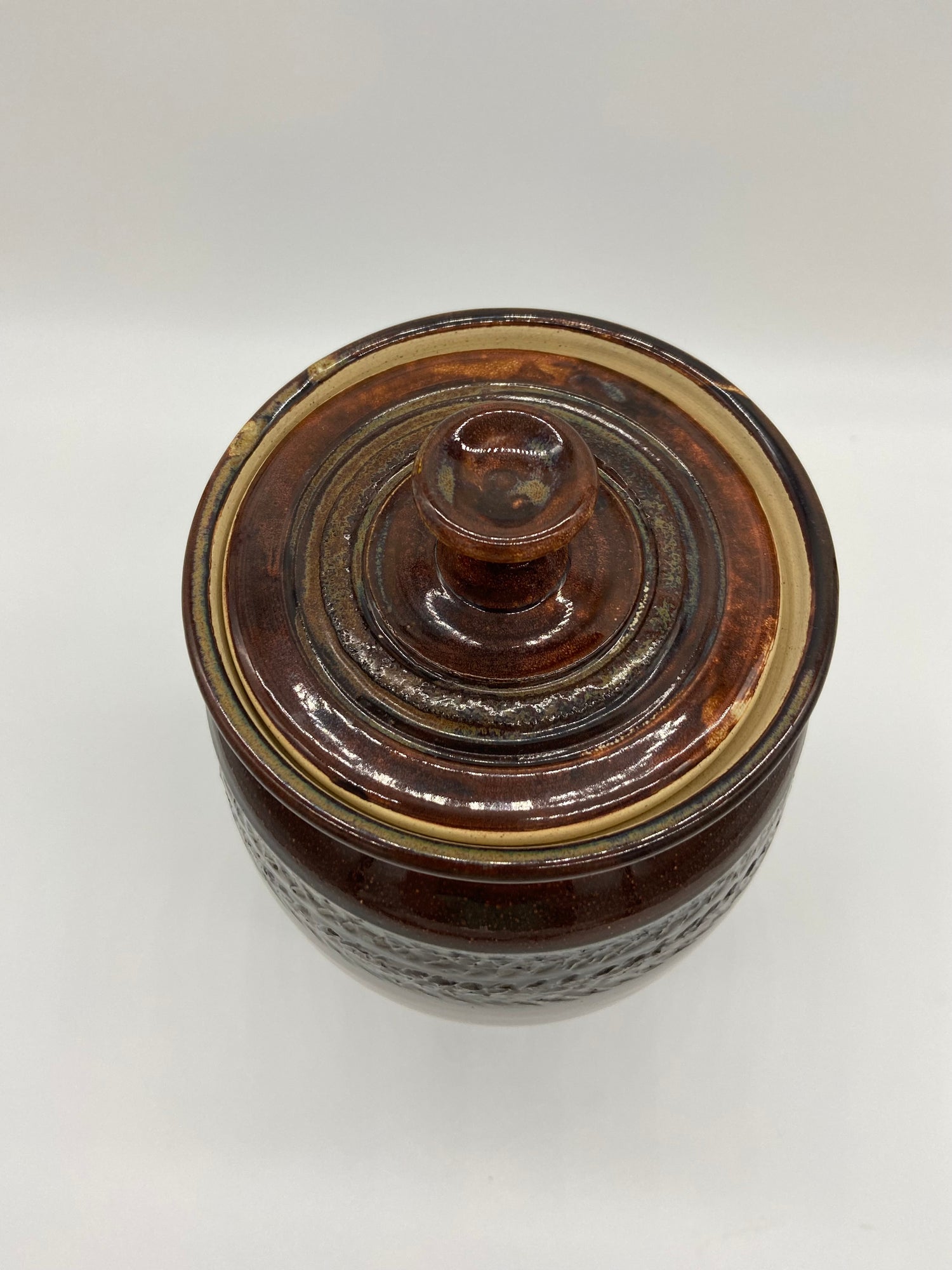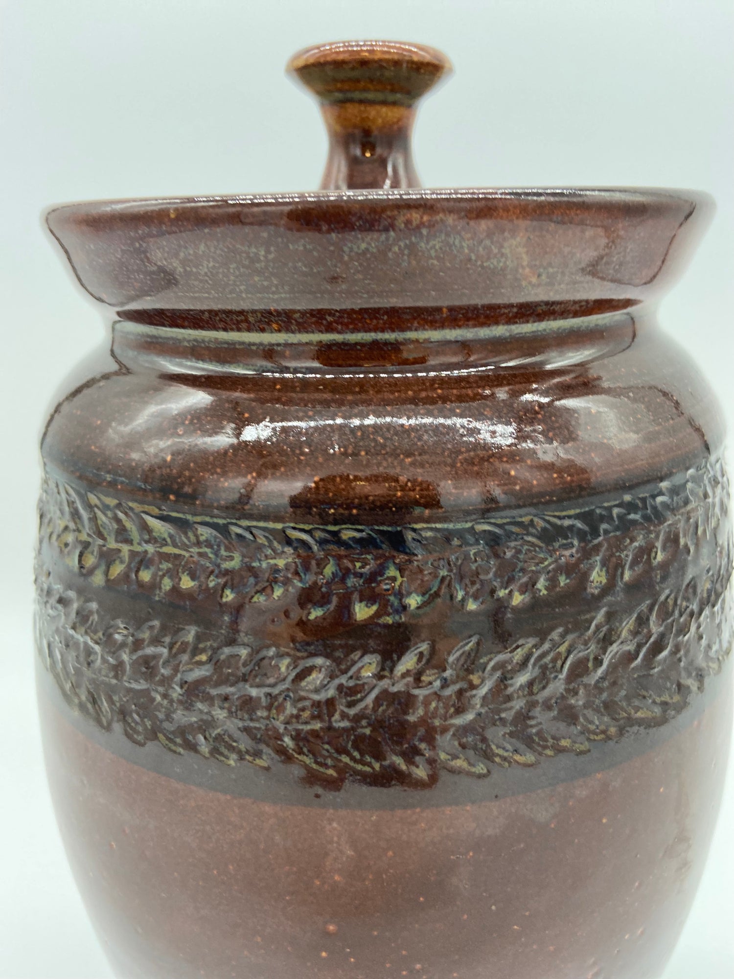 This large urn with a lid is stately in it's handsome form and Antique Iron glaze. It stands approximately 12” tall and 6 1/2" wide at the largest point. This piece serves many purposes including removing the lid and using it as a vase for floral arrangements.