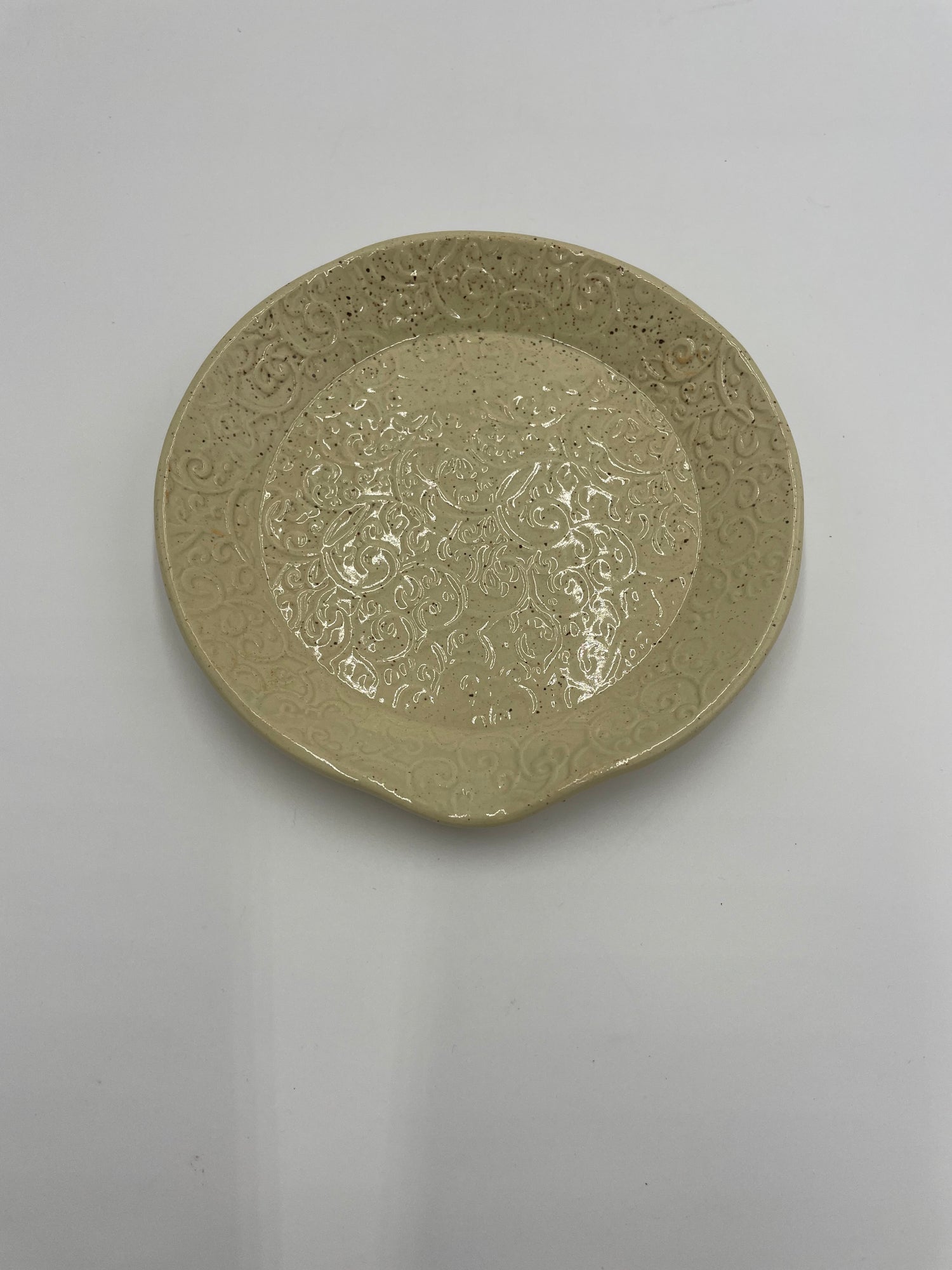 This item was made as a spoon rest, but can double as a dish or tray to hold small items such as jewelry, pills/vitamins, serve as a draining tray for house plants. This one is finished in one of our most versatile glazes, Almond Spice.