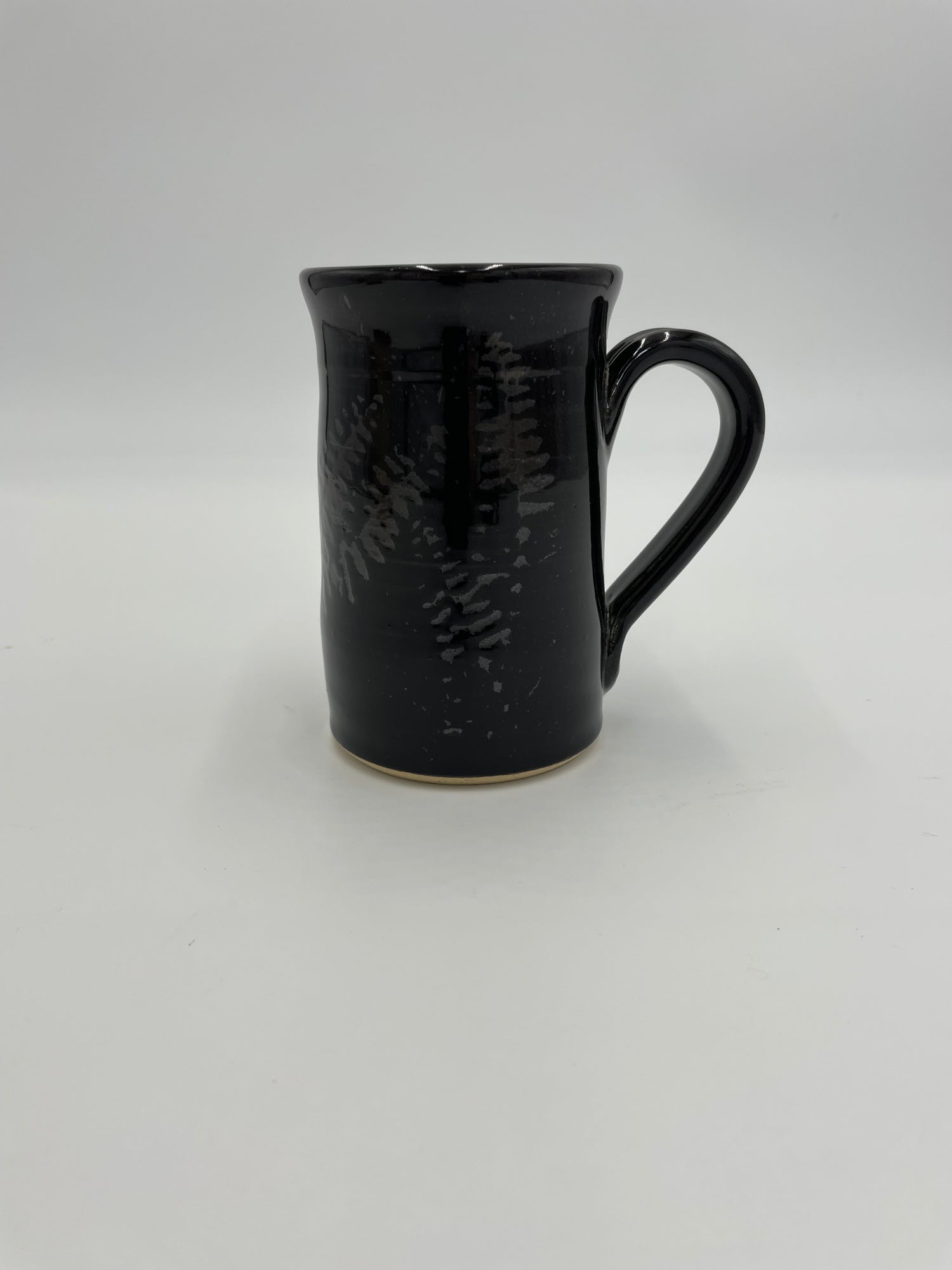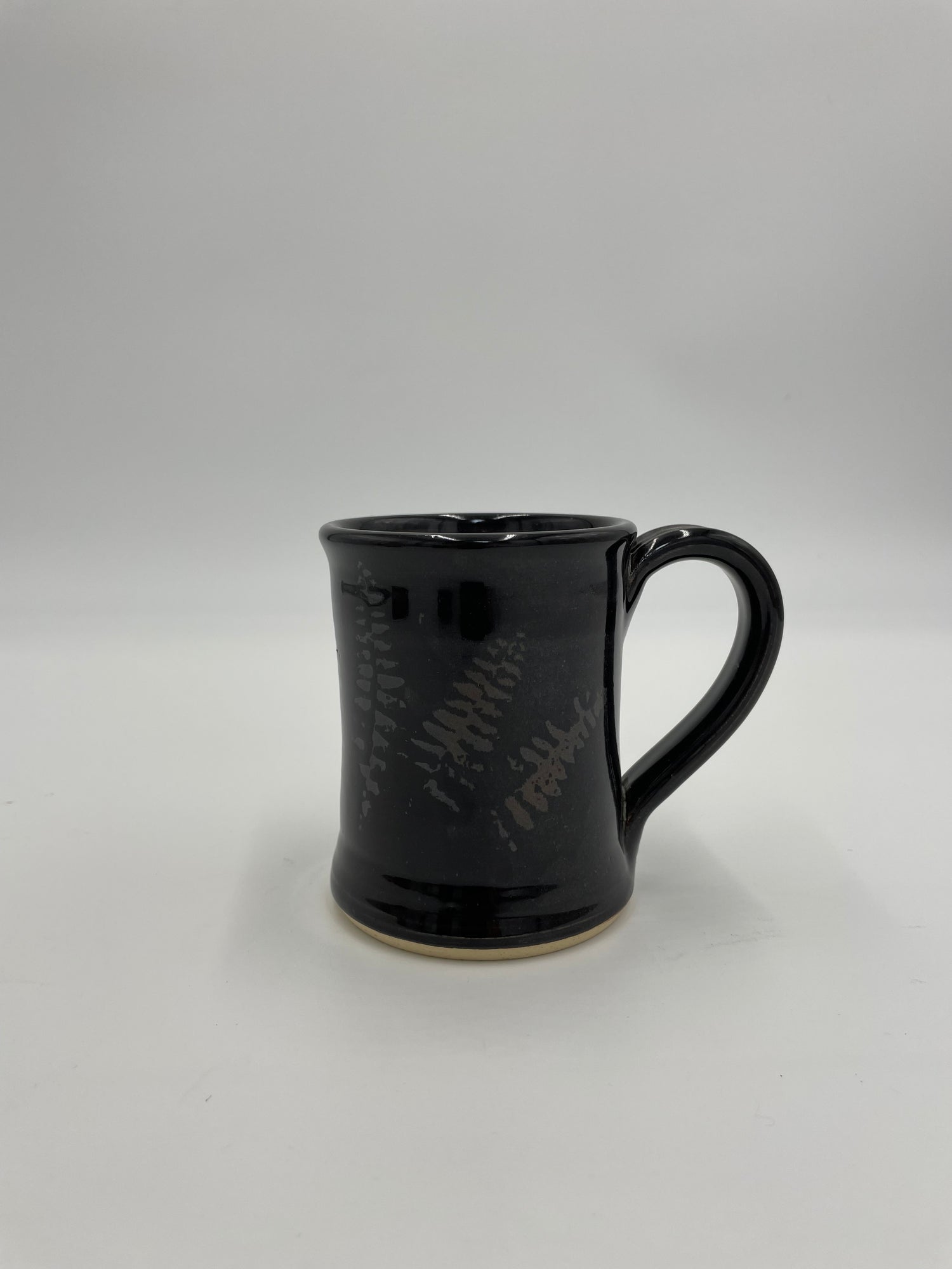 This coffee/tea mug, in our signature Midnight Fern glaze, is approximately 3 1/4” diameter x 4 1/2” tall and holds approximately 12 oz. This glaze is gloss black on the top layer and a burnt sienna underglaze. The fern silhouette is actually created by using a fern frond from our farm.