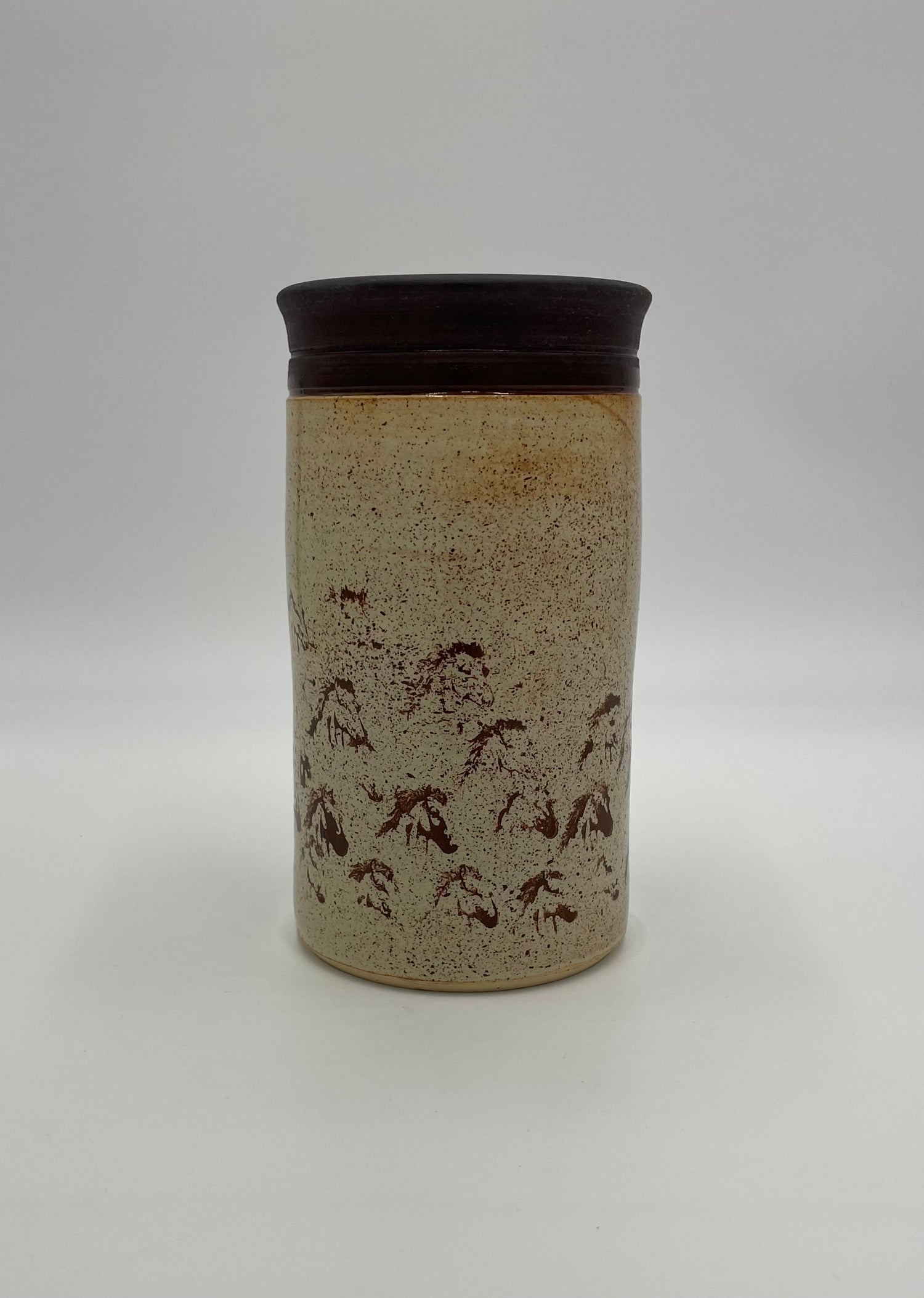 This Duffield Farm Collection utensil crock with a narrow neck measures 4 1/4” diameter x 5 1/2” tall. Dwayne painted and stamped one of his favorite things -- horses -- on this piece! We call it "Dreaming of Horses". We hope you enjoy it!